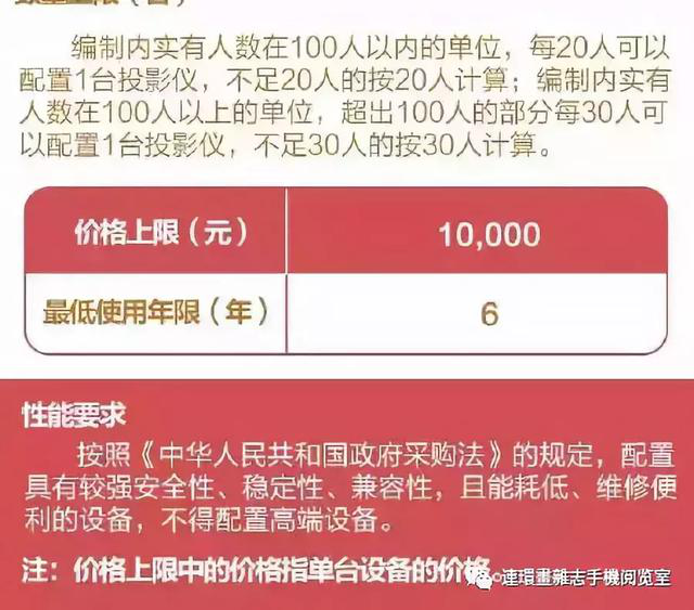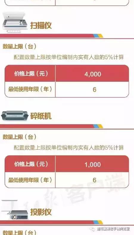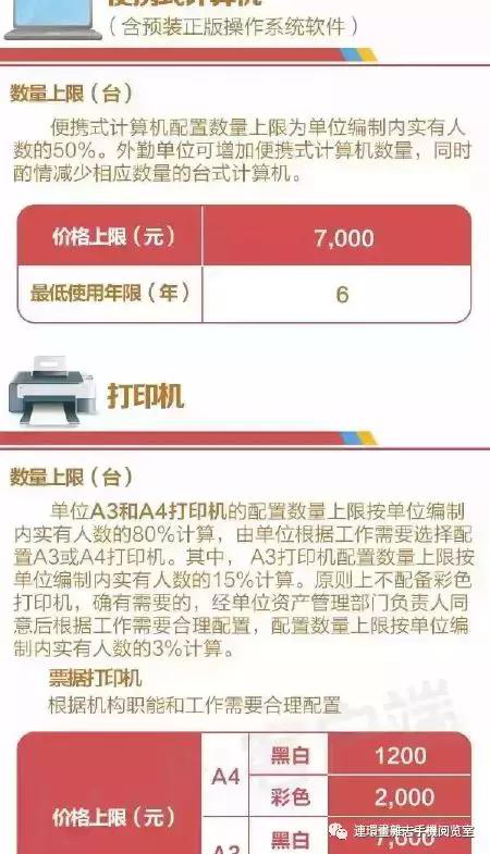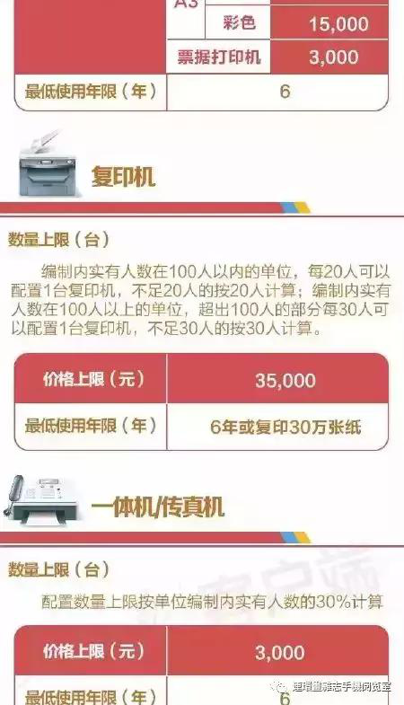通知还对打印机、复印机、传真机等的配置做了规定。明确,编制内实有人数在100人以内的单位,每20人可以配置1台复印机;编制内实有人数在100人以上的单位,超出100人的部分每30人可以配置1台复印机。复印机的价格上限为35,000元,并且规定最低使用年限为6年或复印30万张纸。