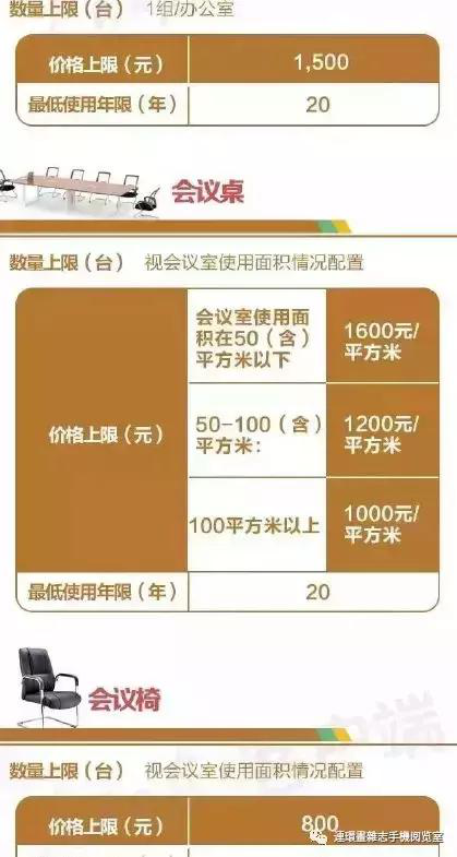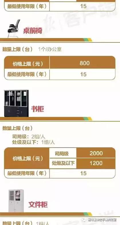 处级及以下人员的办公桌价格不能超过3000元,办公椅不能超过800元,书柜1人1组不能超过1200元,最低使用年限均为15年。