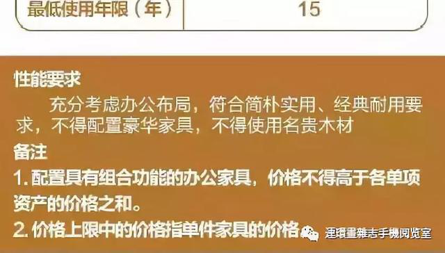 司局级的办公桌价格不能超过4500元,办公椅不能超过1500元,书柜1人2组不能超过2000元,最低使用年限均为15年。