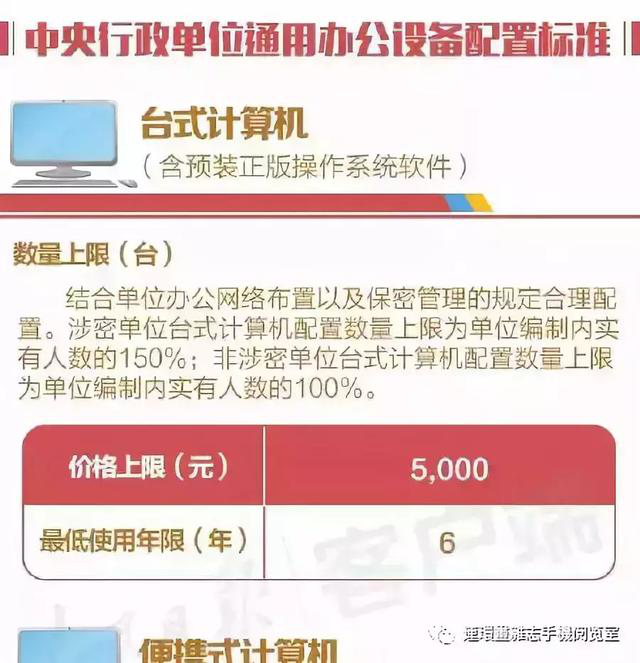 计算机、打印机、扫描仪等办公室设备:电脑最少要用6年,台式的价格上限5000元通知要求,台式计算机(含预装正版操作系统软件)价格上限为5000元,最低使用年限为6年;便携式计算机(含预装正版操作系统软件)价格上限为7000元,最低使用年限为6年。